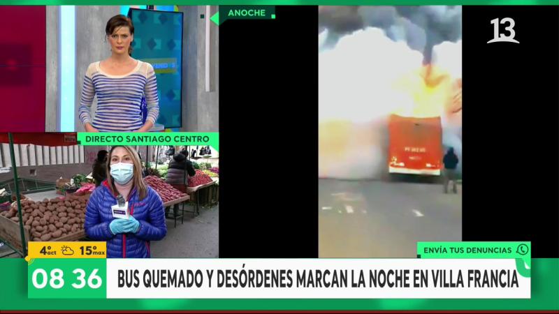 Dichas protestas se registraron en las comunas de San, Joaquín, Puente Alto y Recoleta, lo más impactante ocurrió en Villa Francia, en donde se quemó un bus eléctrico, un grupo de sujetos encapuchados abordaron al chofer lo intimidaron, bajaron a los pasajeros e incendiaron el vehículo, según el relato de Marilyn Pérez.