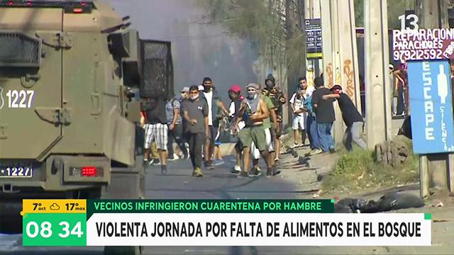 La situación se puso peligrosa, personal de Carabineros llegó al lugar con carros lanza aguas y lanza gases para dispersar la manifestación. Según vecinos, esto se originó por la falta de alimentos y recursos para llevar la cuarentena.