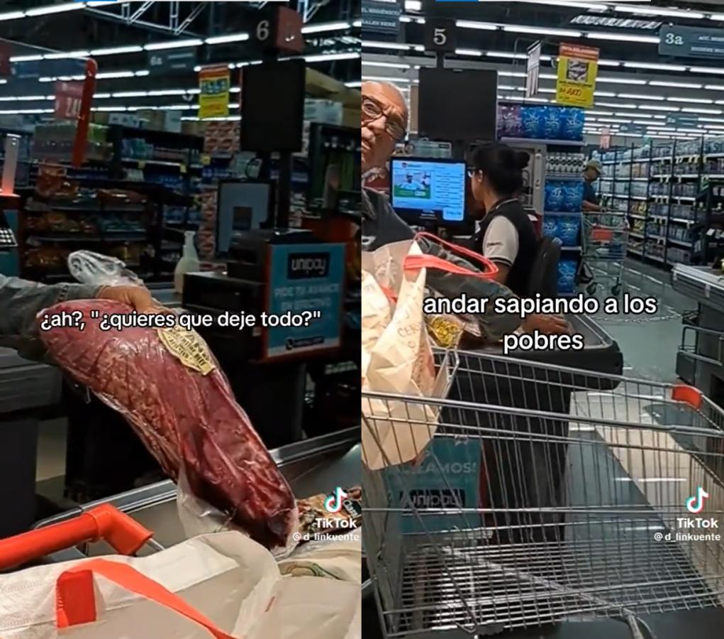 Ante la pregunta del guardia, el sujeto contestó "ya está pagado", lo que fue desmentido de inmediato por la cajera. "¿Quieres que deje todo?… ¿Algo más?, puedes retirarte…", arremetió el hombre.