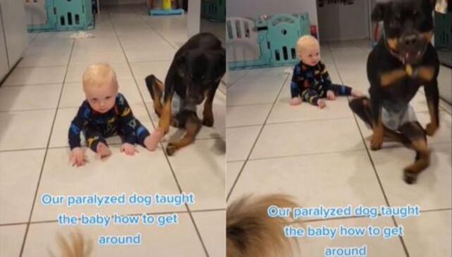 Bebé aprendió a gatear gracias a perrita con parálisis