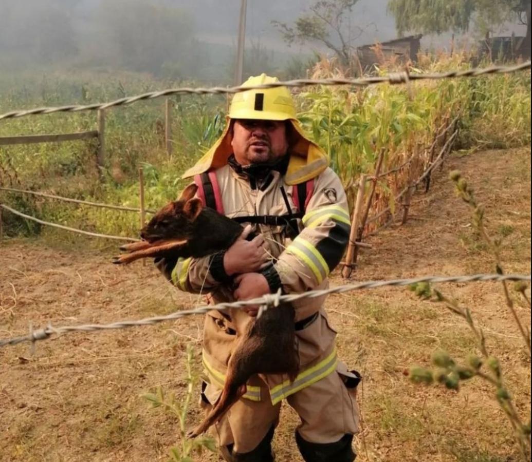 Fue en ese entonces cuando el bombero Jorge Briones vio a un desorientado pudú que se encontraba en medio del incendio. De inmediato, no dudó en tomarlo para asistirlo.