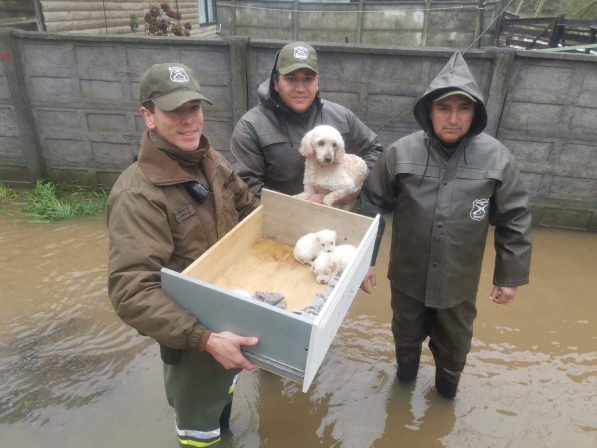 Este martes, Carabineros de la región del Biobío informó que funcionarios de la 2ª Comisaría y Subcomisaría Nonguén lograron rescatar a una perrita y cachorros atrapados en inundaciones.