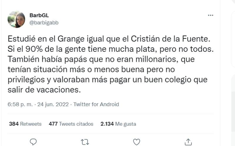“Ibas al Grange (colegio del barrio alto) conmigo, si eso no es ser privilegiado, no sé qué es. Todos nos sacamos la cresta, pero tú y yo partimos mil kilómetros adelante de los demás“, señaló.