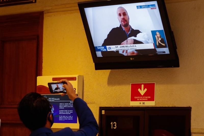 Un fotógrafo de la Agencia Uno capó la especial participación del diputado Bellolio en uno de los monitores que transmite las sesiones registradas en la Cámara de Diputados, en el Congreso.