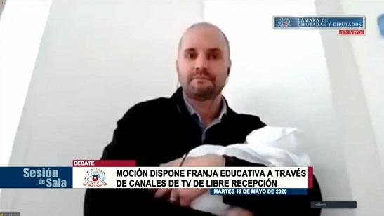 El parlamentario intervino en la discusión, donde se hablaba sobre la moción de disponer de una franja educativa en los canales de televisión, con el pequeño León en sus brazos y desde la clínica donde su esposa dio a luz.