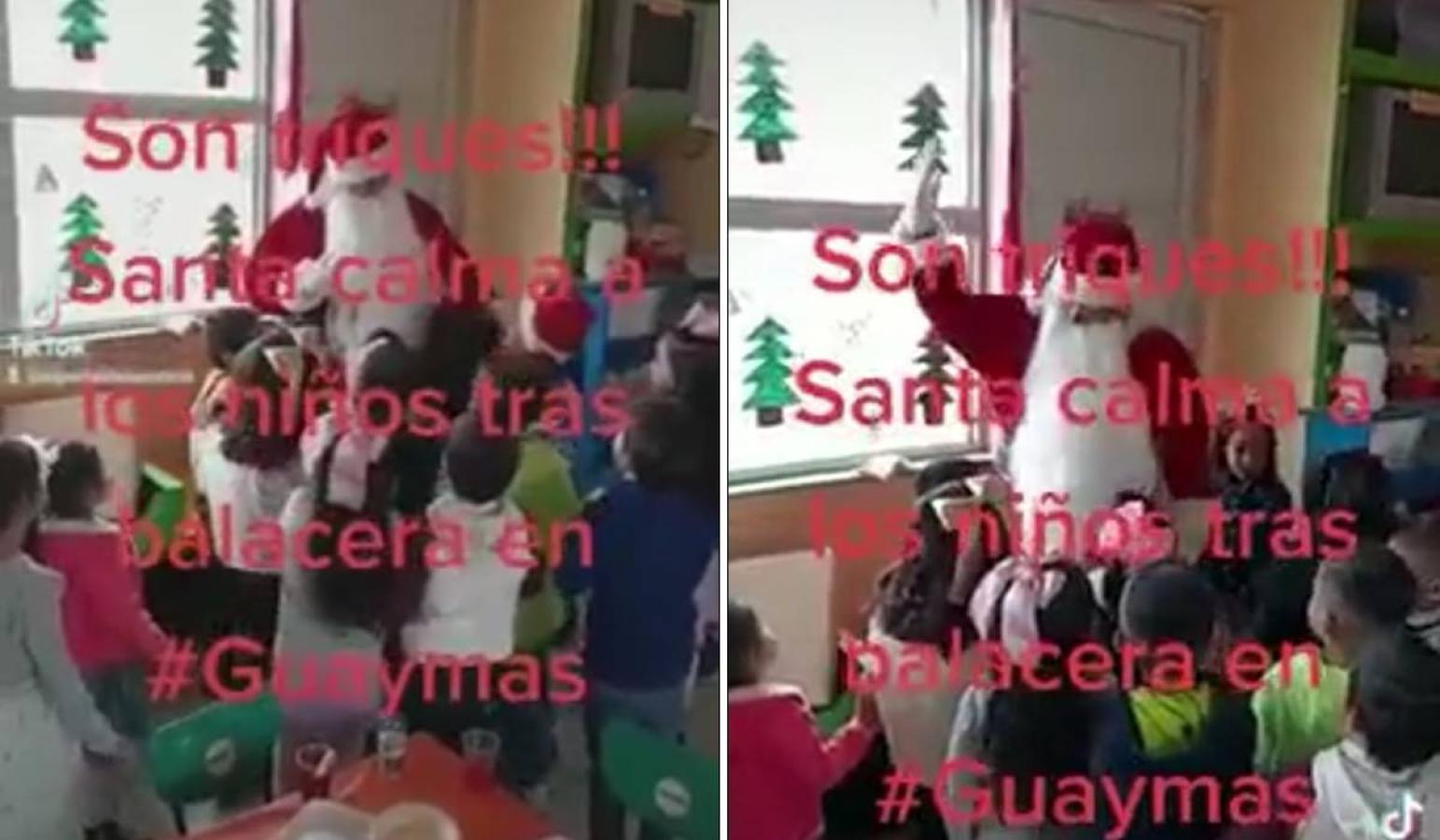 El registro fue grabado en una escuela de Guaymas, en México. En las imágenes se puede ver a Papá Noel hablando con los menores sobre que los sonidos de balas en realidad eran “triques”.