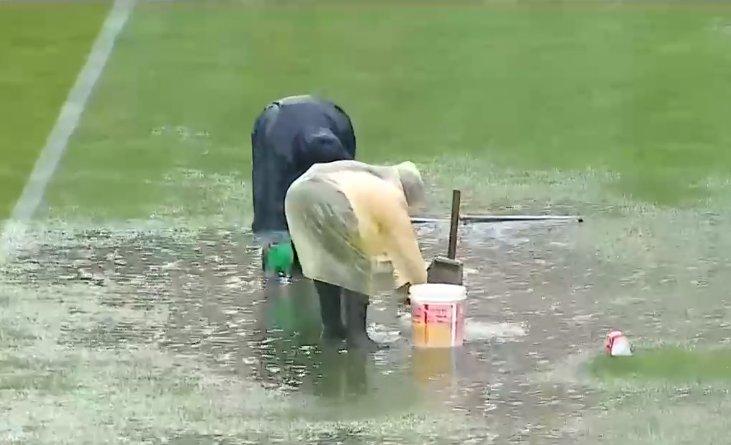 Esta situación se agravó al punto de que personal del recinto debió improvisar una solución para el drenaje de la cancha, y salieron con baldes a remediar la situación.