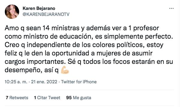 Una de ellas fue la de la cantante y conductora Karen Bejarano, conocida también como Karen Paola. La intérprete de "Viva la Noche" fue una de las que, con un mensaje en Twitter, valoró la nómina ministerial del próximo mandatario.