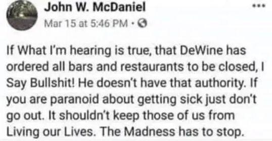 John W. McDaniel había generado polémica por sus posteos en Facebook, donde apuntó al gobernador de Ohio, Mike DeWine, por decretar el cierre de tiendas, bares y restaurantes en el estado.