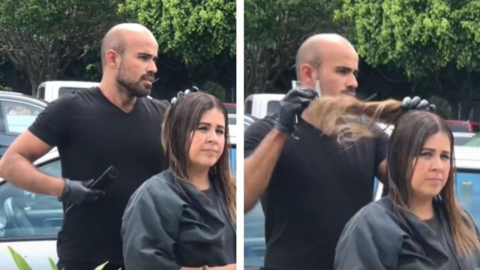 Con guantes y peine en mano, el estilista retira una pinza del cabello de la joven, mientras pone atención a lo que ocurre a su alrededor. Sin duda esta escena llamó la atención de los usuarios en redes sociales, quienes destacaron el profesionalismo del estilista.