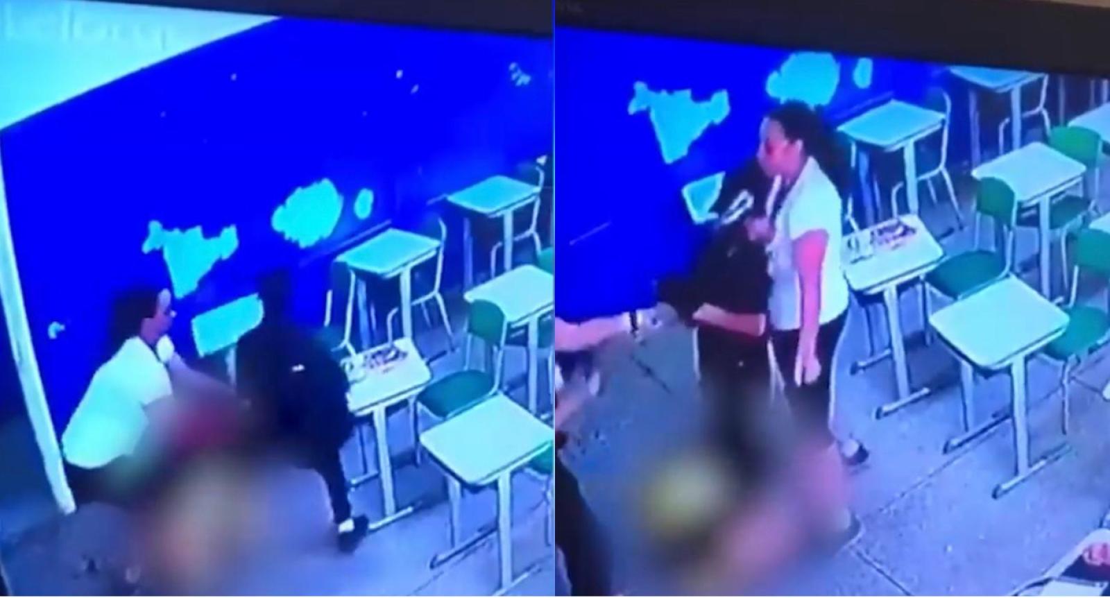Una cámara de seguridad captó impactantes imágenes de la violenta escena, donde se ve al estudiante encapuchado, atacando a la mujer por la espalda durante la clase.
