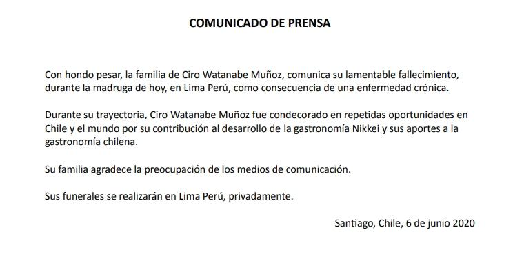 "Con hondo pesar, la familia de Ciro Watanabe Muñoz, comunica su lamentable fallecimiento, durante la madrugada de hoy en Lima, Perú como consecuencia de una enfermedad crónica", fue parte del comunicado confirmado por T13.