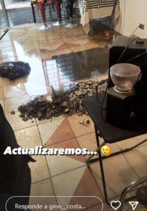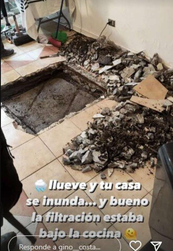En fotos de su cuenta de Instagram, se puede ver la cocina de Gino Costa inundada y parte de la cerámica destrozada.