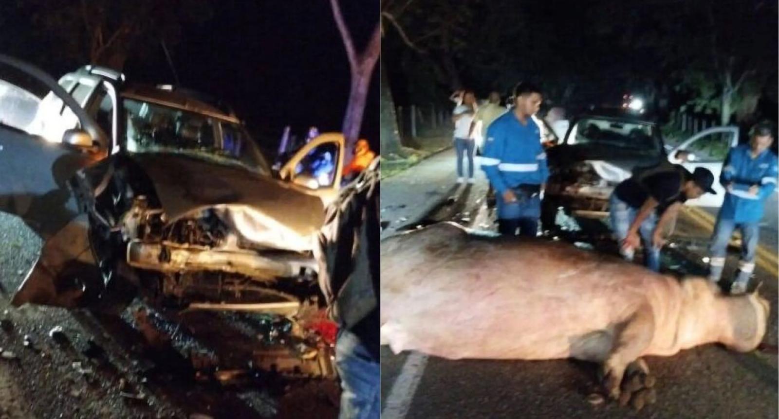 La información preliminar detalla que el animal fue embestido por una camioneta de la marca Renault, modelo Duster, impacto que le costó la vida al hipopótamo y dejó con heridas leves a los pasajeros del vehículo que terminó con toda la parte delantera destrozada.