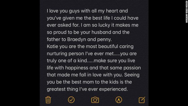 “Los amo con todo mi corazón y me han dado la mejor vida que podría haber pedido. Tengo tanta suerte que me enorgullece mucho ser tu marido y el padre de Braedyn y Penny. Katie, eres la persona más amable y cariñosa que he conocido. Eres verdaderamente única... asegúrate de vivir la vida con felicidad y esa misma pasión que me hizo enamorarme de ti. Ver que eres la mejor madre para los niños es lo mejor que he experimentado”, parte diciendo el mensaje.
