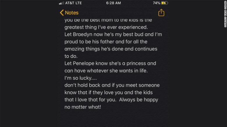 En declaraciones consignadas por CNN, Katie Coelho, esposa del fallecido, contó que tomó el teléfono de su marido. “Por alguna razón en mi delirio, quería sacar todas las fotos de mi esposo y mis hijos de su teléfono”, dijo, revelando que en ese momento encontró el texto que escribió Jonathan.