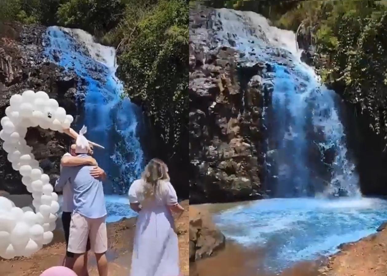 En un hecho que no se puede comprender, una pareja brasileña decidió teñir una cascada para revelar el sexo de su bebé en un baby shower.