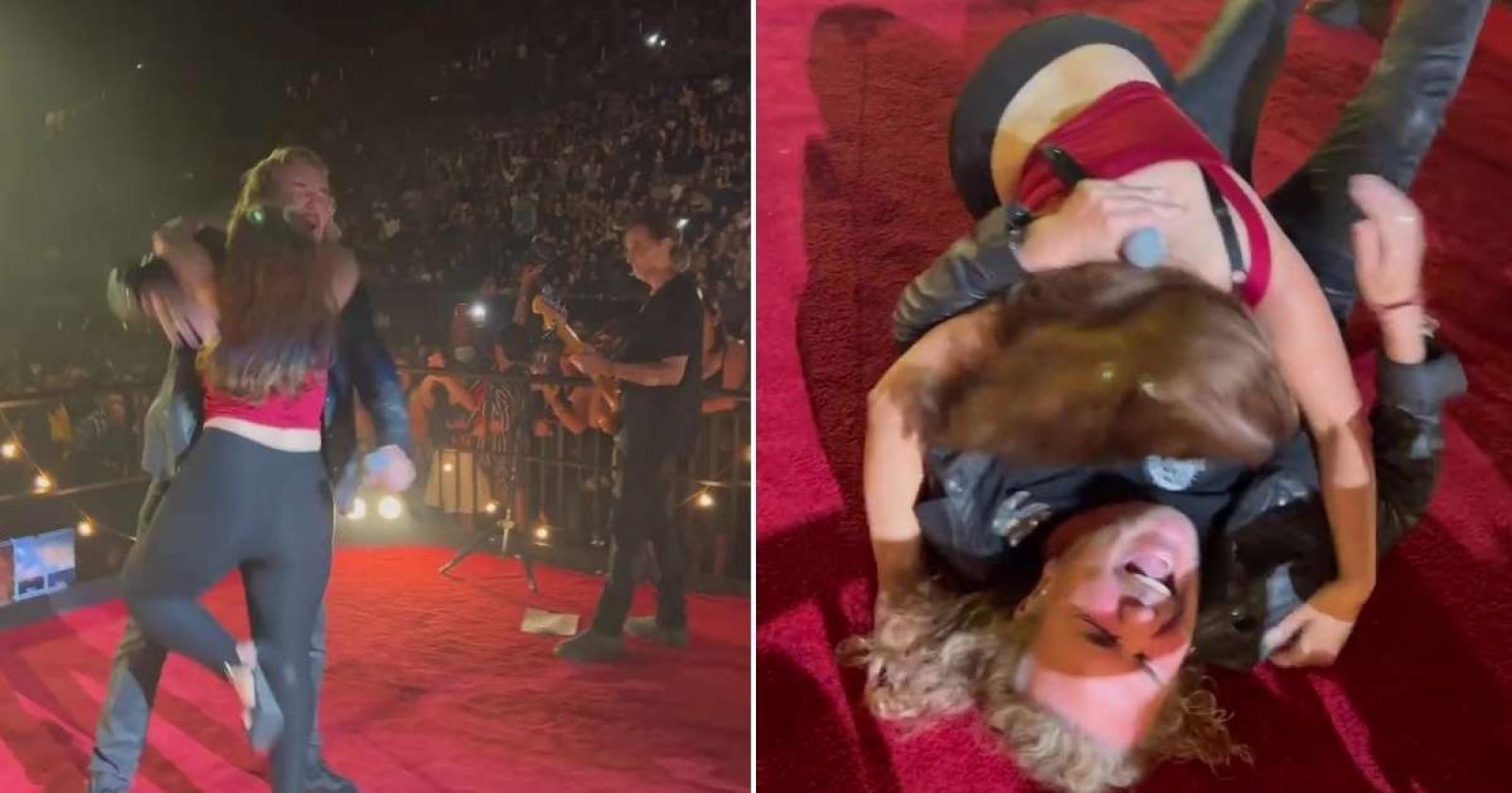 La joven, llamada Nancy, se emocionó demasiado al ver que fue invitada al escenario con la banda que ama, Maná. Sin embargo, la situación sobrepasó a la fanática, quien no contuvo su fuerza y propinó un fuerte "tacle" a Fher, vocalista de la agrupación.