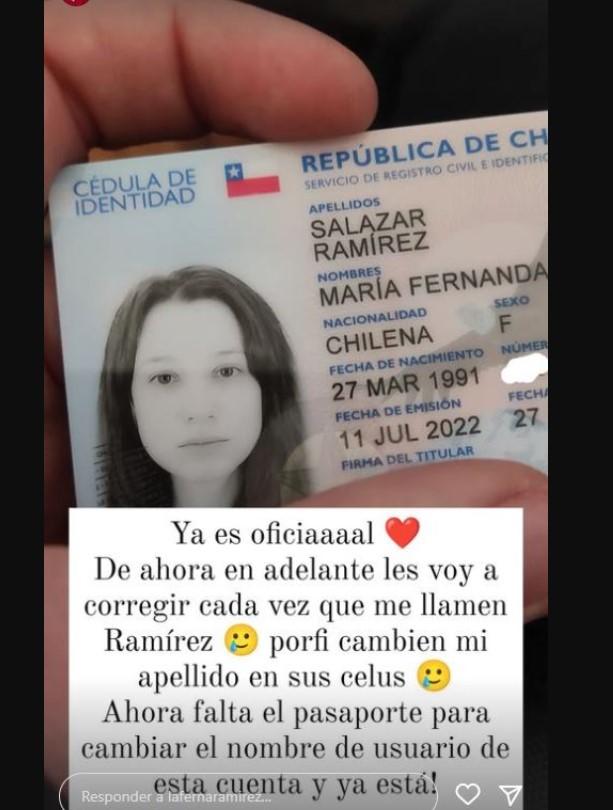 Eso sí, tal como explicó en el live, aún no puede cambiar su nombre de usuario en Instagram (@lafernaramirez), debido a que al tratarse de una cuenta verificada, necesita primero sacar su pasaporte.