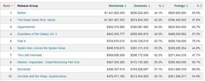 En ese sentido, el sitio especializado Box Office Mojo realizó el conteo de las películas más exitosas, llevándose el primer lugar una que fue todo un hito a nivel cultura, como lo fue "Barbie".