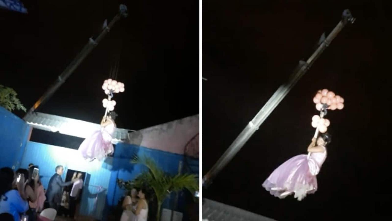 El momento se viralizó por TikTok y en el clip se puede ver a la quinceañera descendiendo de los aires con la ayuda de una grúa que estaba en el patio del hogar, sin ningún problema.