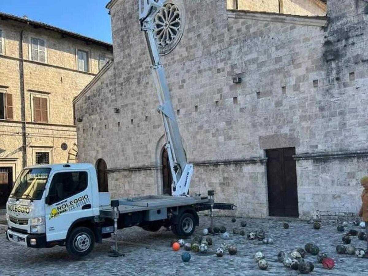 La postal fue tomada en la iglesia de San Tommaso, en el centro de Ascoli Piceno y muestra a trabajadores con una grúa sacando pelotas desde el techo del edificio.