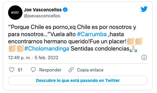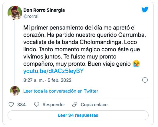 Sin más detalles, este sábado 5 de febrero, el conjunto penquista anunció mediante sus redes sociales el fallecimiento "Carrumba", generando inmediatamente el pesar del mundo artístico nacional.