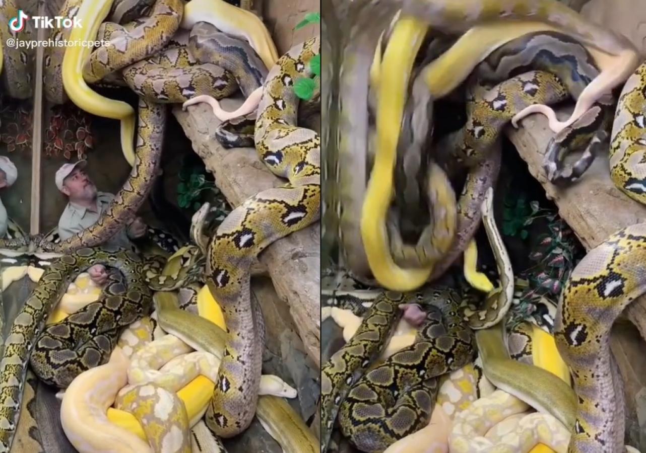 Un trabajador de zoológico sufrió algo que pocos podrían soportar: fue "tapado" por serpientes gigantes mientras grababa un TikTok.