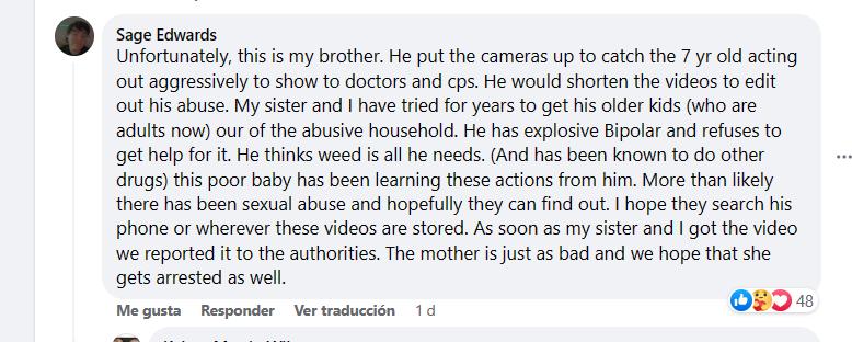 "Desafortunadamente, este es mi hermano (refiriéndose a Aaron Hufford). Puso las cámaras para atrapar al niño de 7 años actuando agresivamente para mostrar a los médicos y a los cps. Él acortaría los vídeos para editar su abuso (...) Tiene bipolar explosivo y se niega a conseguir ayuda para ello", escribió el supuesto hermano.