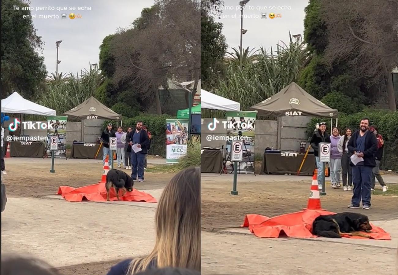 Precisamente, un perrito causó risas y confusiones a los usuarios que vieron el video donde el protagonista de acerca a una bolsa y se acuesta sobre el costado del "muerto", lo que provoca carcajadas en los presentes.