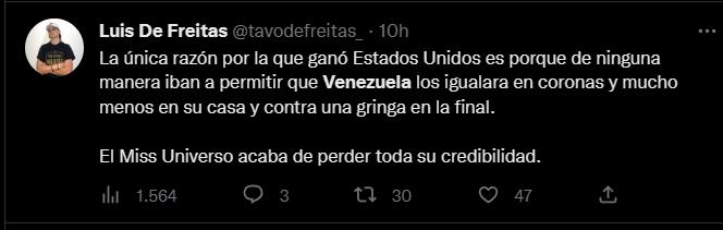 “Nos robaron la corona, pero todos sabemos que Amanda Dudamel ES Miss Universe 2022”, escribió otra.