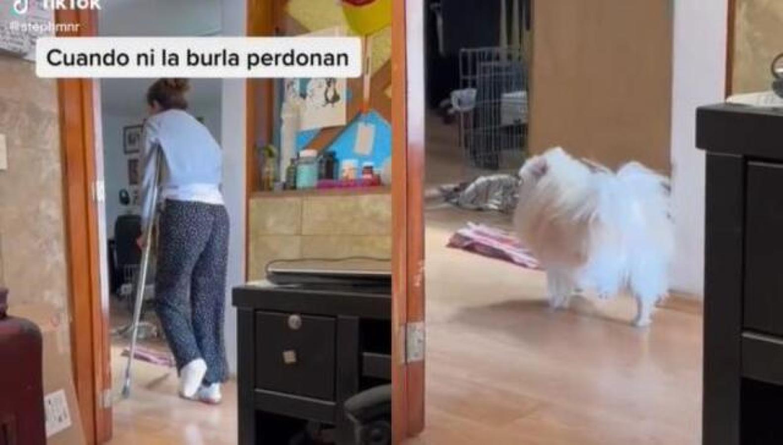 Luego de pasar caminando en muletas, uno de sus perritos la sigue desde atrás e imita su caminar dejando su patita de atrás arriba. "Cuando ni la burla perdonan", escribió en el video la mujer.