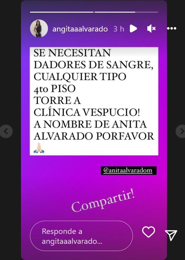 A través de su cuenta de Instagram, la hija de la llamada “geisha chilena”, Angie Alvarado, pidió a sus seguidores dirigirse a la Clínica Vespucio para donar sangre.