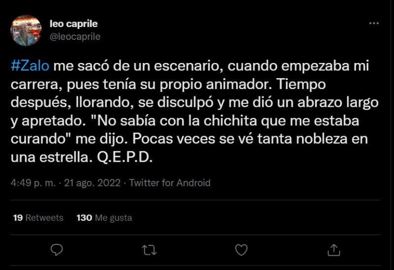 “#Zalo me sacó de un escenario, cuando empezaba mi carrera, pues tenía su propio animador. Tiempo después, llorando, se disculpó y me dió un abrazo largo y apretado. "No sabía con la chichita que me estaba curando" me dijo. Pocas veces se vé tanta nobleza en una estrella. Q.E.P.D.”, escribió en su Twitter.