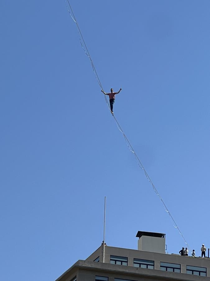 ¡Sorprendente! Funambulista cruzó la Alameda a 50 metros de altura