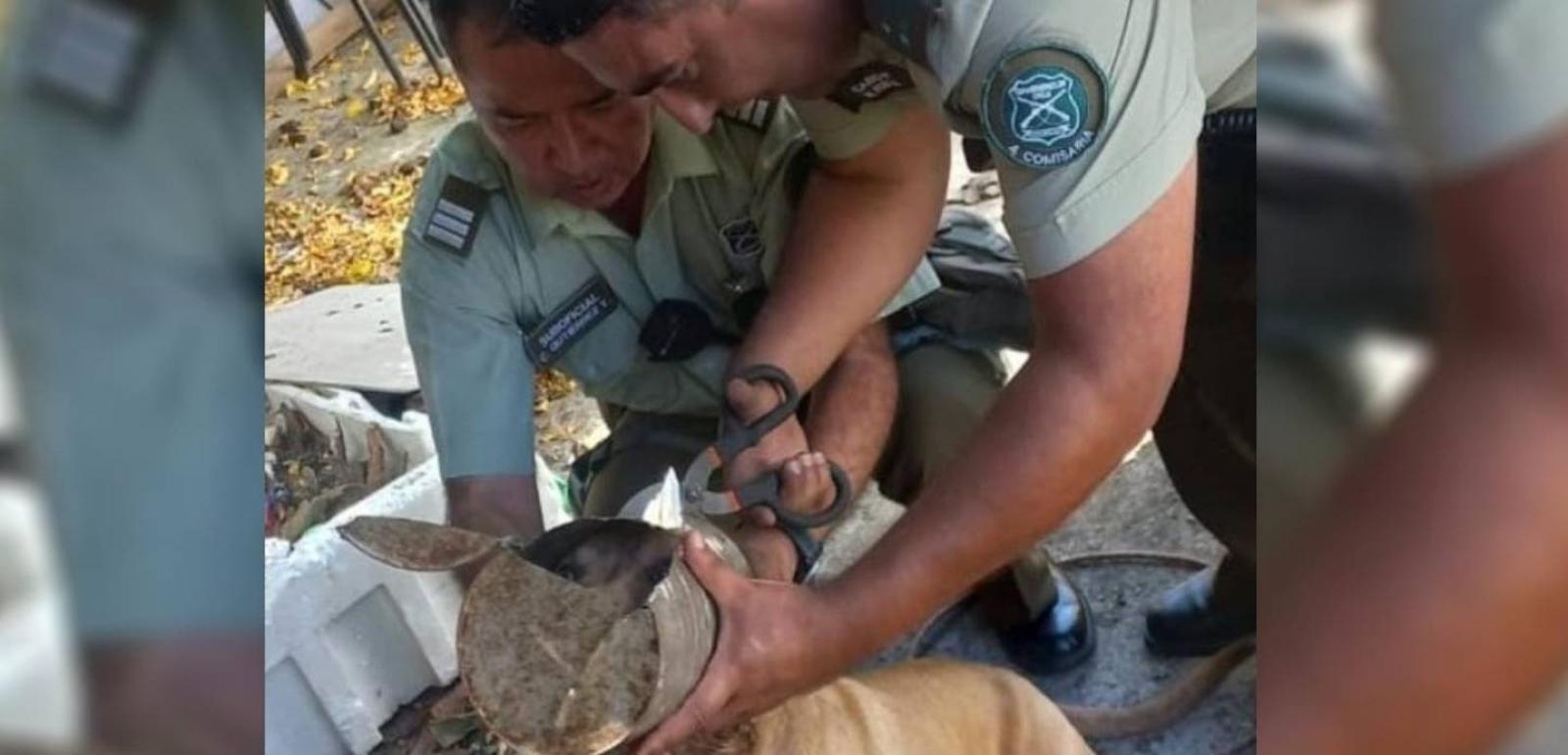 Un grupo de funcionarios de Carabineros logró rescatar a un perrito que había atascado su cabeza en un tarro y peligraba su vida.