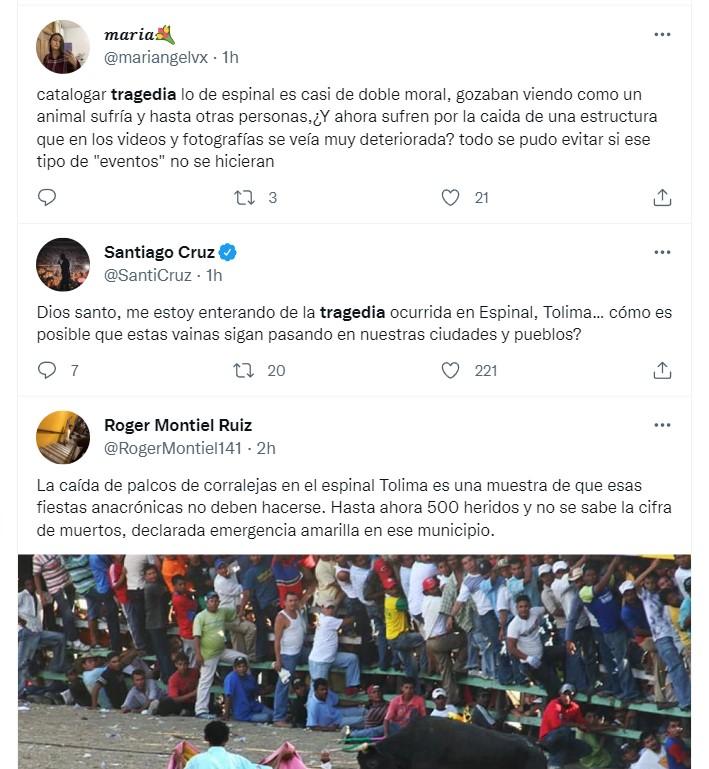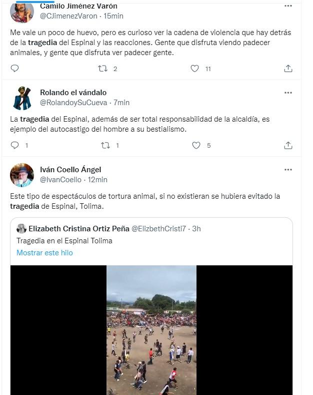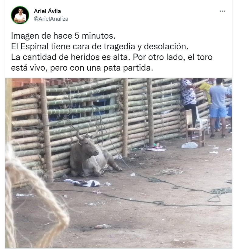 “Espero que todas las personas afectadas por el derrumbe de la plaza de El Espinal puedan salir airosas de sus heridas. Esto ya había sucedido antes en Sincelejo. Le solicito a las alcaldías no autorizar más espectáculos con la muerte de personas o animales”, escribió en Twitter.