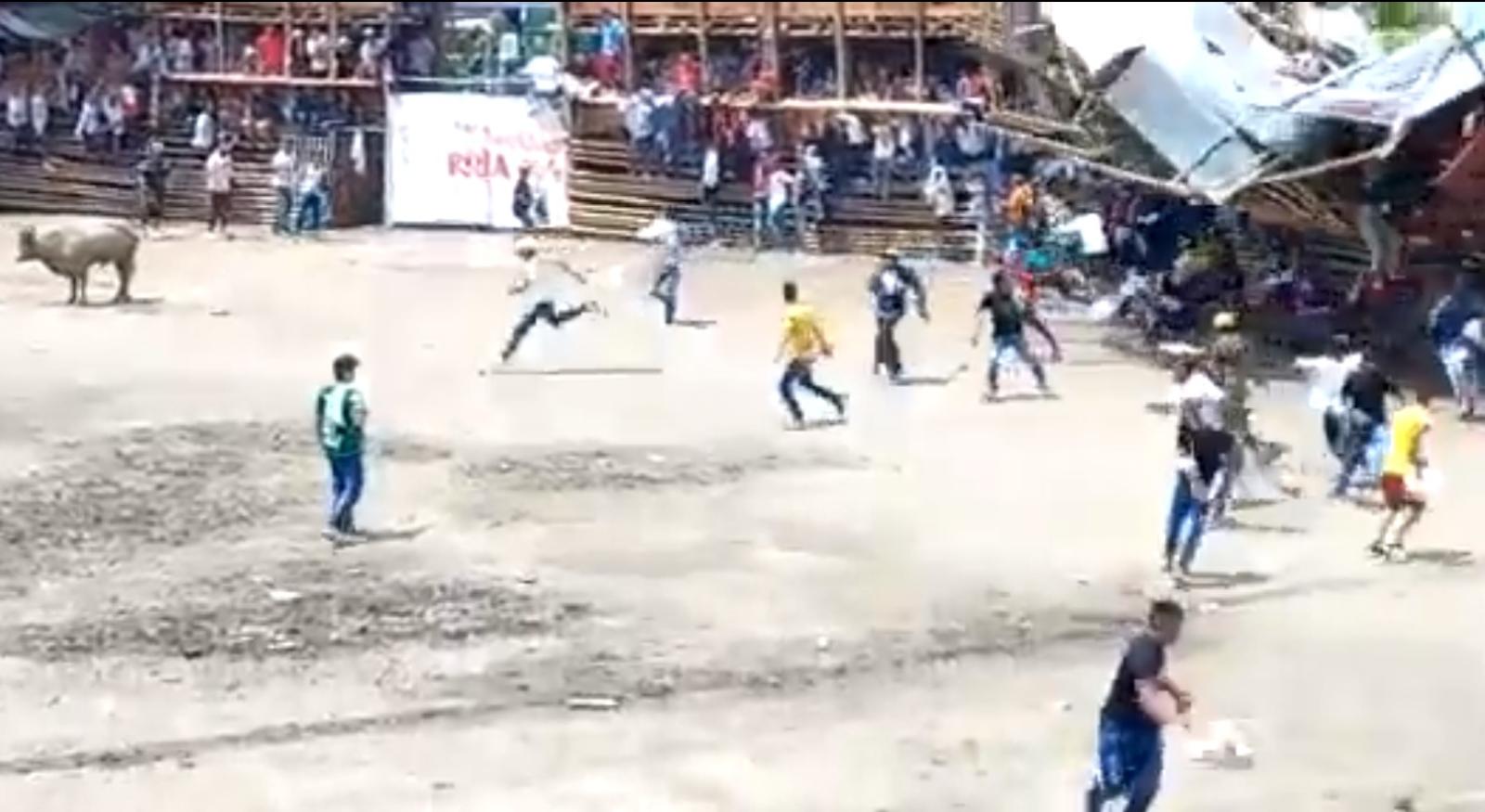 En un video difundido en redes sociales, se puede ver al toro en medio de la plaza y rodeado de varias personas cuando de repente los palcos comienzan a caerse abajo y la gente empieza a huir.