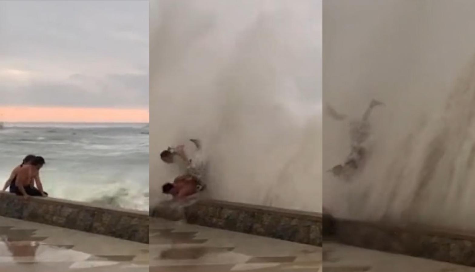 El primero video difundido muestra cómo los muchachos desafían la ola y se ríen de la situación. Sin embargo, la segunda vez la ola es mucho más fuerte y los hace volar por los aires.