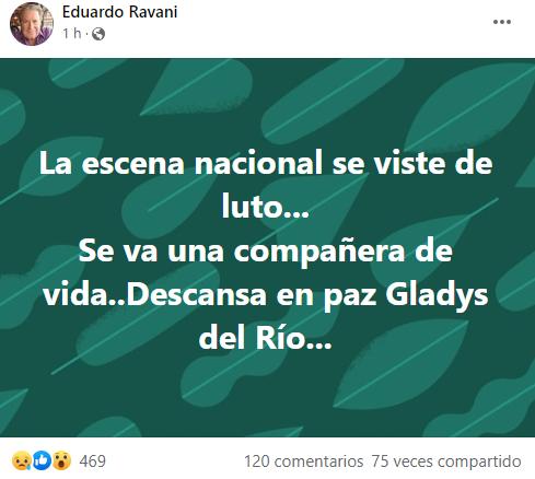 “La escena nacional se viste de luto… Se va una compañera de vida… Descansa en paz Gladys del Río”, publicó el actor.