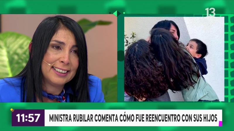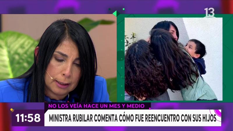 Rubilar no pudo esconder su emoción luego de que le mostraran una foto del reencuentro con su familia. “Me mataron…Chuta, estuve un mes y medio sin ellos…Ay, me mataron”, afirmó la secretaria de Estado con evidentes dificultades para hablar producto del impacto por la bella imagen.