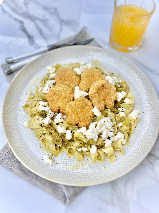 1. Primero cocer en abundante agua los fetuccini con una pizca de sal. Mientras se cuecen, preparar la salsa pesto y nuestros Nuggets Among Us.