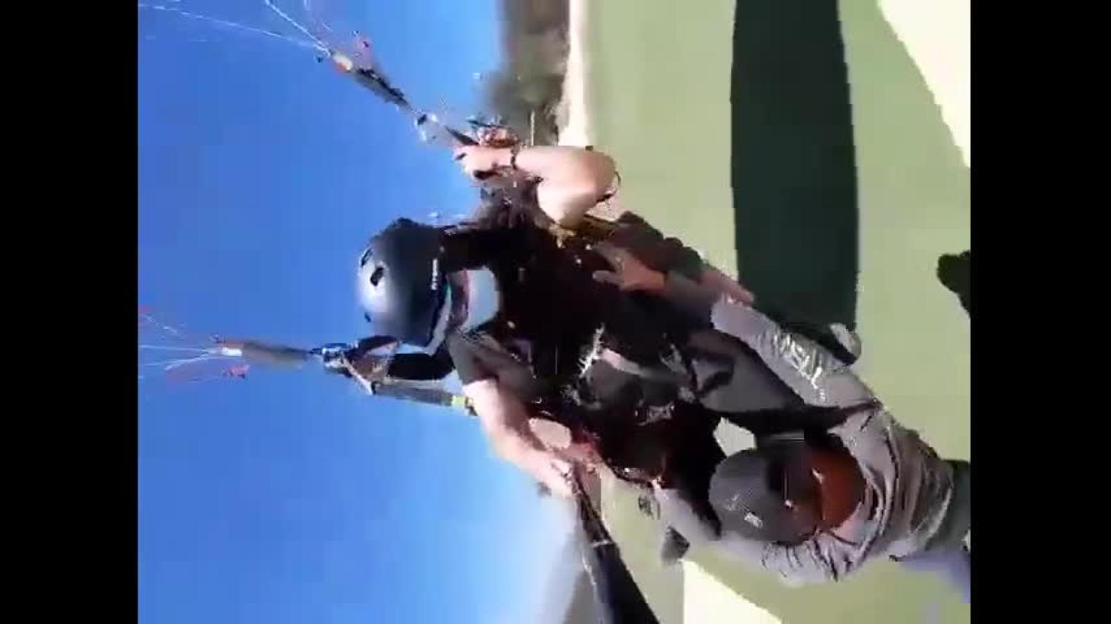 Revuelo e impacto causó en redes sociales un video donde se ve a un instructor de parapente volando a varios metros de altura, sujetado solo de sus brazos, luego de no poder soltarse tras el despegue.