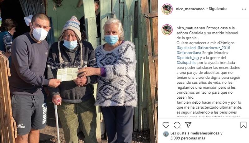 A través de su cuenta oficial de Instagram (@nico_matucaneo), el jugador de Colo Colo dio a conocer este martes la información. “Entrega de casa a la señora Gabriela y su marido Manuel de La Granja. Quiero agradecer a mis amigos y a la gente del Sifup por la ayuda brindada para poder satisfacer las necesidades a una pareja de abuelitos que no tenían una vivienda digna para seguir pasando sus años de vida”, escribió Maturana.