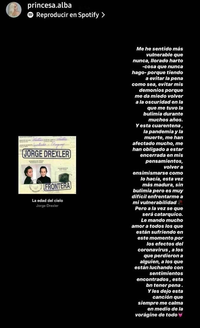Princesa Alba agregó que “esta cuarentena, la pandemia y la muerte me han afectado mucho, me han obligado a estar encerrada en mis pensamientos, volver a ensimismarse como lo hacía, esta vez más madura, sin bulimia, pero es difícil enfrentarme a mi vulnerabilidad”.