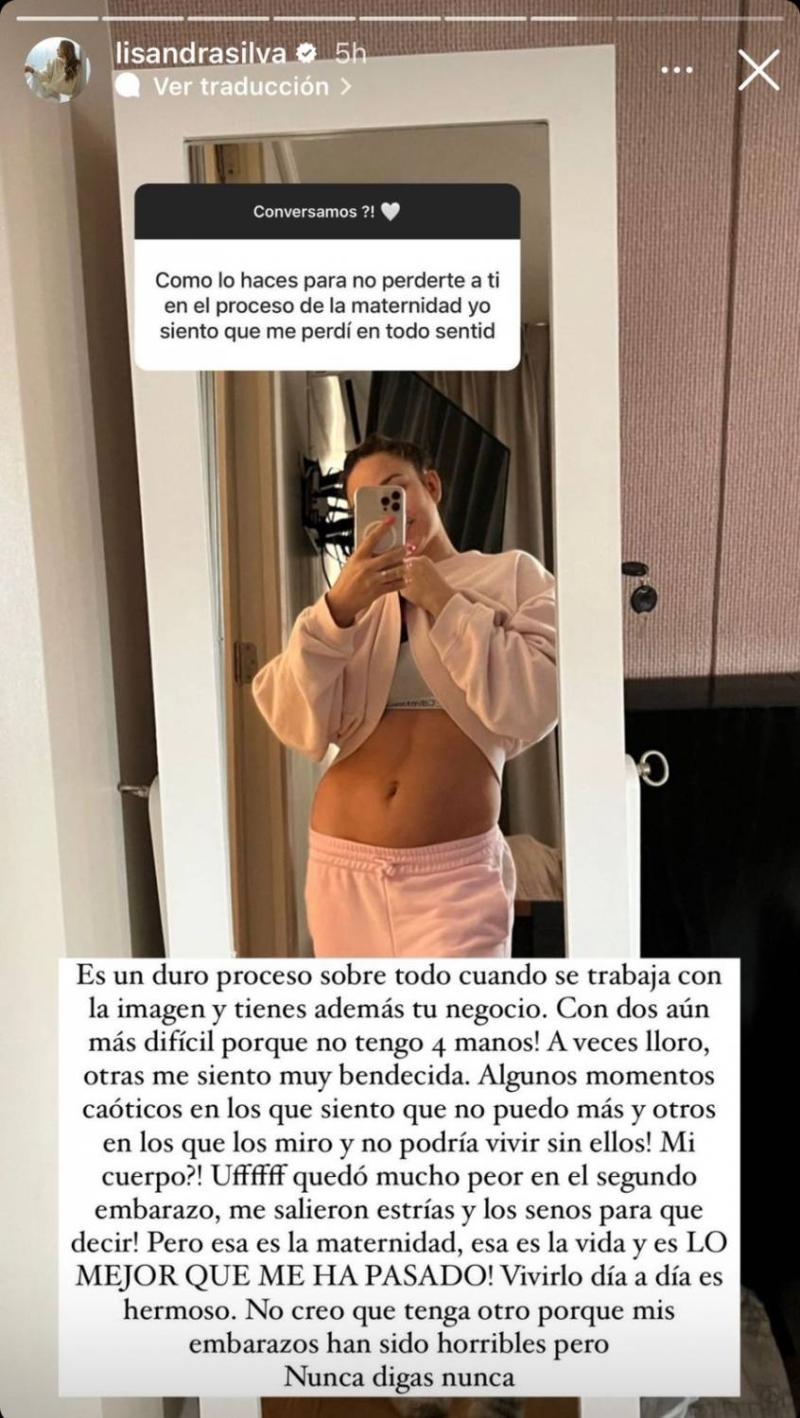 A través de una dinámica de preguntas y respuestas, Lisandra Silva, respondió a una pregunta de uno de sus seguidores donde reflexionó sinceramente sobre la maternidad.