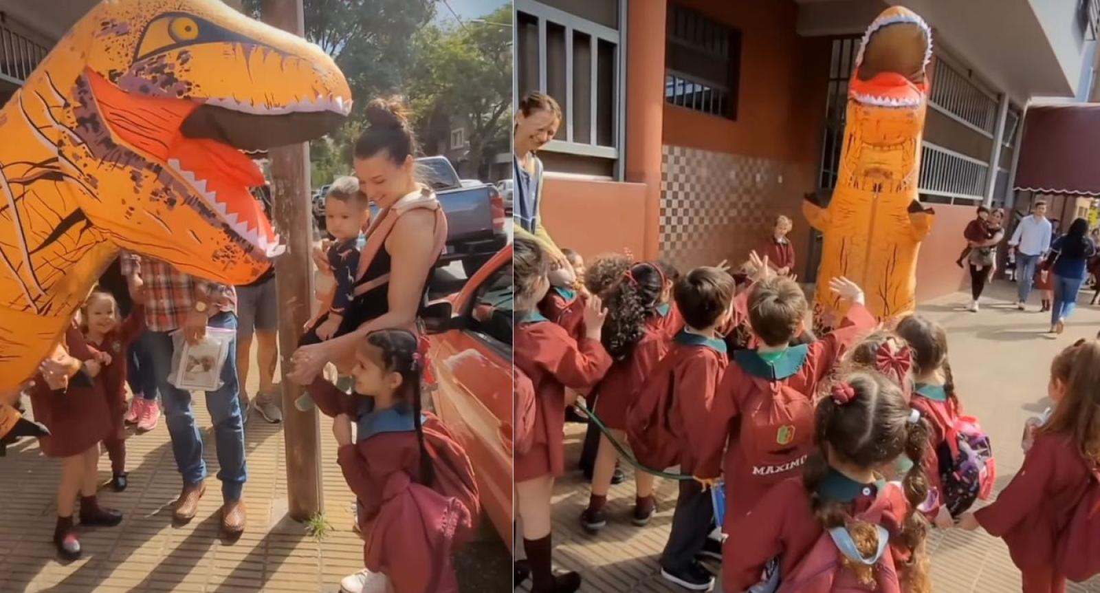 El registro fue compartido por la red social de Instagram, video difundido por la usuaria @andrisanmartin, que iba pasando por el exterior del recinto escolar, cuando notó la efervescencia de varios niños, alucinados por el disfraz de dinosaurio que estaba utilizando la abuelita.
