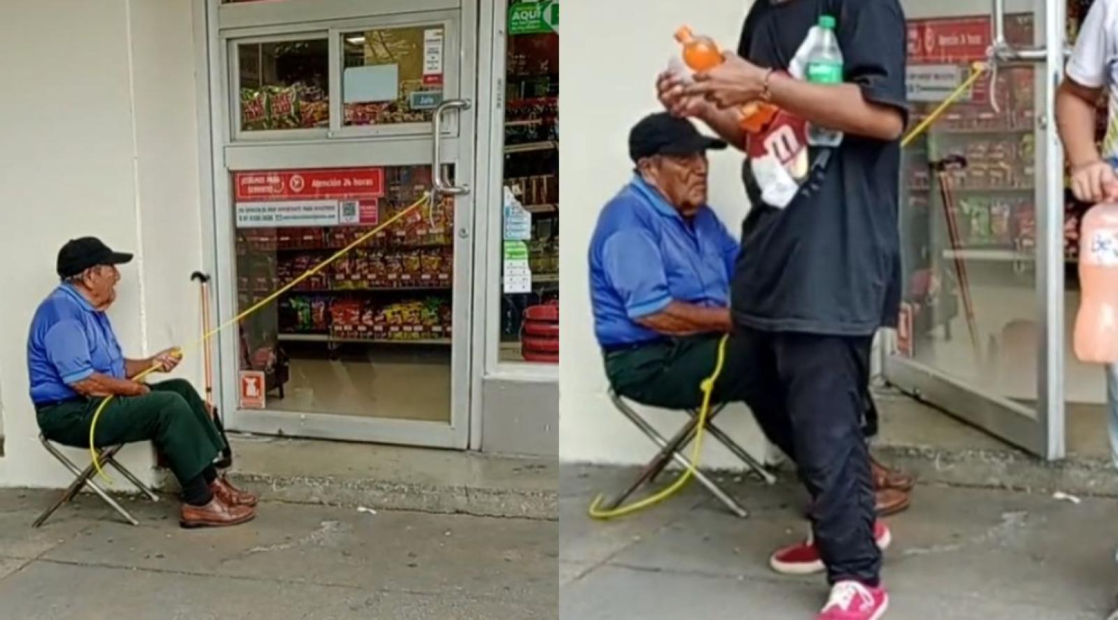 En el video, capturado en la entrada de una tienda Oxxo, se puede ver cómo el adulto mayor está sentado en una silla, abriendo la puerta de los clientes por propina, para que ellos no tengan que "empujar" ni "tirar" de ella.