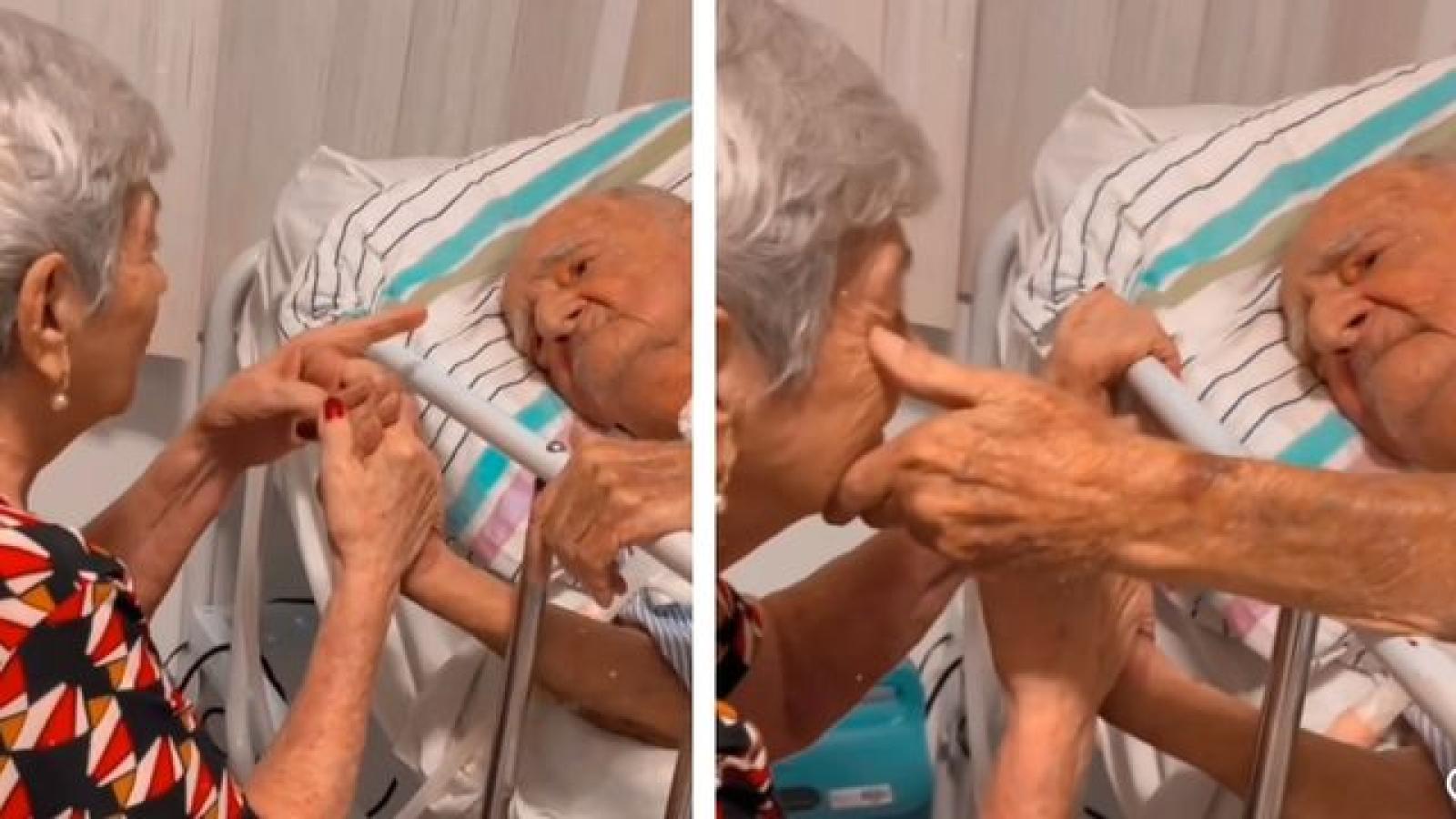 Al terminar la canción, el adulto mayor extiende su mano temblorosa para sostener la mejilla de su amada.