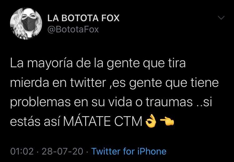 A través de su cuenta de Twitter (@BototaFox), la transformista enfrentó a quienes la cuestionan en redes sociales, especialmente en esa plataforma. “La mayoría de la gente que tira mierda en Twitter es gente que tiene problemas en su vida o traumas…Si es así, mátate”, escribió la comediante durante la madrugada.